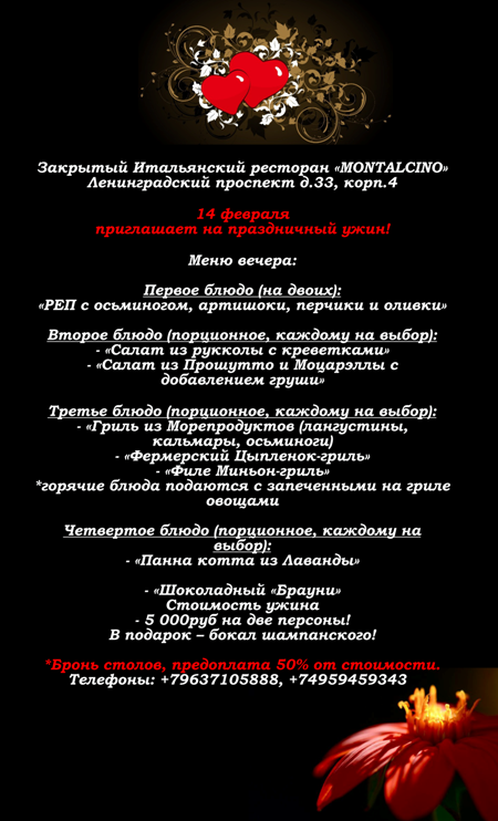 - Праздничные сеты для влюбленных в ресторане «Montalcino»! Бронь столов!